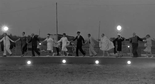 While each parallel contains some autobiographical truth, each contains an element of Fellini’s fabulist subjective truth as well. More than an accurate depiction of his past, present, and fantasy worlds, Fellini seeks to represent his own psychological state and blends reality and dreams, quite often deceptively so. To do this, the director creates an anxious tempo that leaps from one moment to the next with all the impulsiveness of the unconscious mind. Though Fellini may not have the intentional control of Alfred Hitchcock or Stanley Kubrick, he relays his own psychological state in all its frenzied glory, even though at times his psychological expulsion may seem lessened by the way he disguises his confessions in stylistic abandon. But 8 ½ is less about cataloging Fellini’s personal hang-ups than his process of accepting them. In the film’s original, unused ending, Guido and his wife sit in the dining car on a train; the other passengers are people from Guido’s life, all smiling at him approvingly. Despite the apparent approval, the moment would have had a creepy undertone if left in the film, because it never explains where the train was going. (Hell or heaven, perhaps? Back to reality? Who can say?) Fellini shot the film’s actual ending, where a parade of characters dance around Guido’s sci-fi setpiece, as a theatrical trailer, using eight cameras. This final ending exists as an antithetical Dance of Life to counteract the clear influence from the Dance of Death at the end of Bergman’s The Seventh Seal (1957, yet another Bergman influence on 8 ½), This ending marks a celebration of self-acceptance. Fellini told one interviewer, “Self-acceptance can occur only when you’ve grasped that the only thing that exists is yourself, your true, deep self which wants to grow spontaneously, but which is fettered by inoperative lies, myths and fantasies that propose an unattainable morality or sanctity or perfection—all of it brainwashed into us during our defensive childhood.”