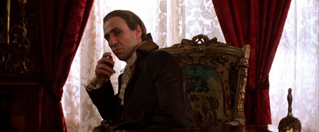 Abraham earns his Oscar by portraying Salieri as a man of painful inner conflict. Every smile has a double-meaning, a hidden hurt, as Salieri remains torn between his jealousy for Mozart and his wholehearted admiration of the genius’ music. But this character is torn in other ways as well. He prides himself on abstaining from women and drink, yet cannot help himself around sweets. Always at his desk or atop his instructing piano rests a dish of candy morsels. When Salieri first sees Mozart, he looks for someone who appears to have been venerated by God. While looking, he is distracted by servants setting out a luxurious feast; he regards the spread, lets out a quiet moan of food ecstasy, and later sneaks into the room alone to steal a truffle. Salieri’s vice may not fall into gluttonous extremes, but in this single incident, he has given in to his own temptation. How duplicitous or simply self-unaware then that in his accounts to the priest, he portrays himself as an obedient servant of the Lord, completely oblivious to his own double standard and convenient condemnation of Mozart.