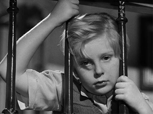 Although Baines protects the boy from Mrs. Baines—such as when he slides the box with McGregor across the dining table, knowing that if his wife finds the snake, she will kill it—Baines remains a child in a world of adults. When Inspector Crowe and Detective Ames (Jack Hawkins) arrive to question Baines about his wife’s death, the butler’s confident manipulation of Phillipe’s confidence descends into a nervous rambling with officials. Only an actor of Richardson’s skill, most frequently deployed on the London stage, could capture such stark changes in the same character. He may act as Phillipe’s brave protector, but Baines is no mastermind and certainly maintains no semblance of cucumber cool when faced with questioning. He paces back and forth, visibly sweats, stumbles over his words, and recants statements when confronted with alternate details. “Of course,” he says, “that’s what I meant.” Like a child who tries to cover a white lie with even more lies, Baines makes himself look guiltier, more culpable with each statement, despite Julie encouraging him to simply tell the truth. Likewise, Phillipe’s lies to cover for Baines become increasingly outlandish, much to the incredulity of the authorities. It is only when Det. Ames discovers a footprint in some potting soil on the ledge where Mrs. Baines fell that the police uncover the truth—not by any statements made by either Baines or Phillipe.