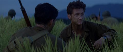 Fox 2000 agreed to finance on the condition that notable stars populate the cast, and with the director’s reputation in mind, performers flocked to give screen tests. The cast as it appears in the film remains unparalleled for its star power: George Clooney, John Cusack, Nick Nolte, James Caviezel, Sean Penn, Thomas Jane, John C. Reilly, John Travolta, Elias Koteas, and Ben Chaplin fill the cast, some with only periphery roles. And still, there were actors such as Kevin Costner, Lukas Haas, Viggo Mortensen, Gary Oldman, Bill Pullman, Mickey Rourke, Martin Sheen, and Billy Bob Thornton who tried for roles and were not cast, or whose roles were filmed but their scenes were left on the cutting room floor. Amazingly, despite these stars, Fox’s advertising campaign focused on the director’s return. Shooting took place in Australia and the Solomon Islands over a hundred days. Geisler and Roberdeau were banned from the set by Malick after persistent arguments took place over the director’s approach. Malick threatened to remove their names from the credits if they appeared on the set again. Academy Award-winning cinematographer John Toll grew frustrated with Malick’s improvisation onset and harsh shooting schedule, which ultimately produced more than a million feet of footage for the initial cut. In post-production, Malick would improvise even more when he reduced the six-hour raw cut by half, and then added the film’s signature voiceovers, which were not in the script.