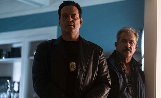 Just as Bone Tomahawk was a twist on classical Westerns and Brawl on Cell Block 99 was a riff on prison exploitation flicks of the grindhouse era, Dragged Across Concrete embraces hard-boiled cop movies of the 1970s. The two cops at the center are Brett Ridgeman (Mel Gibson), a nearly 60-year-old detective whose vile behavior has prevented him from moving up in the department, and his partner Anthony Lurasetti (Vince Vaughn), a capable cop who respects Ridgeman. When we first meet them, they use excessive force to capture a Latin American suspect and humiliate the perp’s topless girlfriend; the first act is caught on video, leading to their suspension. When their commanding officer (Don Johnson) informs them of the decision, they let their intolerance for political correctness be known in a clumsily written diatribe. They’re tired of the hypocritical media acting like moral watchdogs and preventing good cops from doing good police work. Lurasetti tries to make light of the situation. “I’m not racist,” he says, “Every Martin Luther King Day I have a cup of dark roast.” It’s difficult to watch this conversation without questioning whether Zahler endorses these views or simply puts them forth as character flaws.