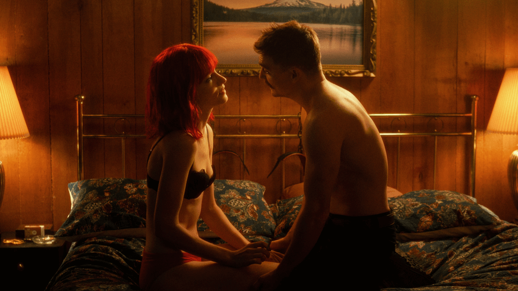 Plenty of curious details occur, particularly with the hippie characters who woof down an absurd breakfast—Begely Jr.’s character prepares food like a 4-year-old would—before working on a Scott Baio puzzle. Stranger still is the credited cinematographer, Giovanni Ribisi, a longtime actor who shows that he’s been paying attention behind the scenes. Before the opening titles, Strange Darling proudly announces, “Shot entirely on 35mm,” and there’s good reason for such pride. Ribisi employs lighting that evokes the work of Robert Richardson (JFK, 1991) and camera movements worthy of Michael Ballhaus (After Hours, 1985). The film boasts rich colors, with a particular affinity for reds (Fitzgerald’s shoes and nurse scrubs, Gallner’s flannel, everyone’s blood) and greens (showcasing the Oregon exteriors). It’s a heightened visual treatment with expressive tricks, such as split-diopter lensing and fade-outs to primary colors. Editor Christopher Robin Bell allows these visuals to flourish with a longer-than-average shot length, both patient and assured. Such bold choices are contrasted by the slow, gentle songs performed by Z Berg and more aligned with Craig DeLeon’s jarring score—music with reverberating grandiosity, discordant sounds, and booming guitar riffs.